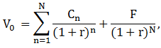 Vnitřní hodnota (V0) dluhopisu s fixním výnosem odpovídá vztahu: ![]() kde Cn představuje pevnou kuponovou platbu v n-tém roce životnosti dluhopisu, F je jmenovitá hodnota dluhopisu vyplacená v době jeho splatnosti, N je počet let do splatnosti dluhopisu a r je tržní úroková míra neboli požadovaná výnosová míra. Dluhopisy s nulovým kuponem (zero coupon bonds) jsou dluhopisy, ze kterých nejsou vypláceny po dobu své životnosti kuponové platby, a jediným příjmem investora z dluhopisu je vyplacení jmenovité hodnoty v době splatnosti dluhopisu. Proto jsou tyto dluhopisy emitovány s diskontem, což znamená, že emisní cena dluhopisu je nižší než jeho jmenovitá hodnota. Z výše uvedeného vztahu lze snadno odvodit hodnotu dluhopisu s nulovým kuponem. Protože jediným příjmem z dluhopisu s nulovým kuponem je jmenovitá hodnota vyplacená na konci životnosti dluhopisu, pro jeho vnitřní hodnotu platí: ![]() kde symboly odpovídají výše uvedenému popisu.